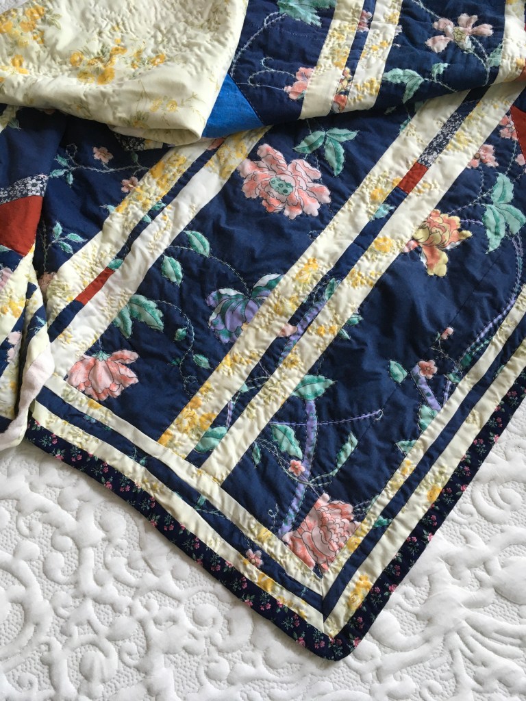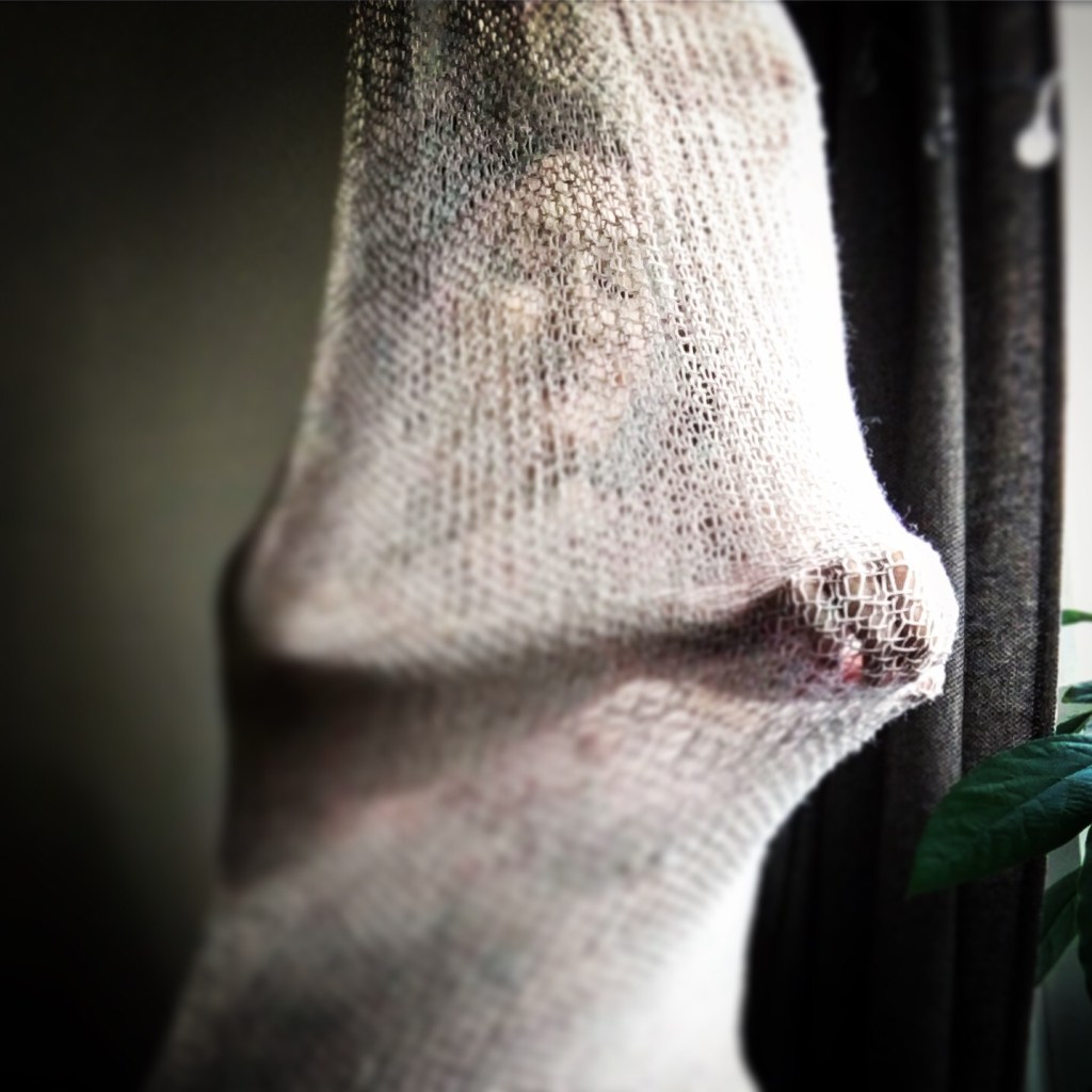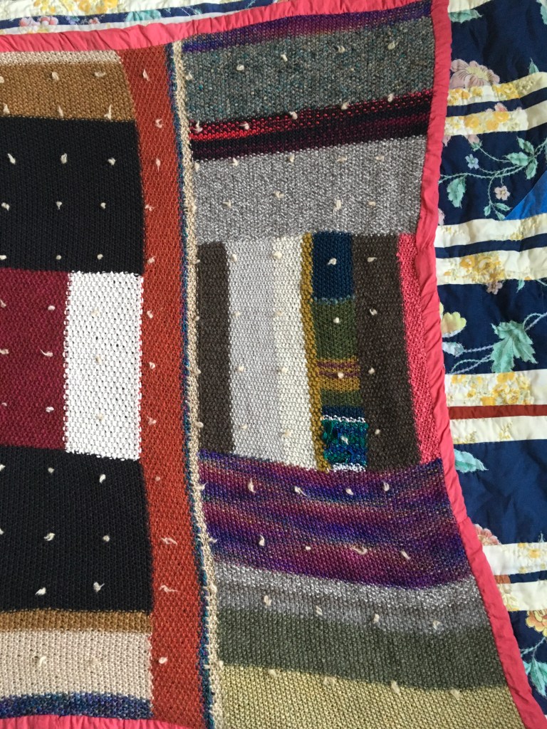 Presently, NET/WORK includes the following textiles: an 8×8′ net knitted during a winter of deep illness; a body-sized tube with drawstrings on both ends, which takes on the form of whatever–whoever–crawls inside; a floral memory quilt made with bedsheets and table linens from the artist’s friends and family; a scrap lap blanket, knit with remnants of yarn leftover from other projects over the span of four years; and several other large-scale works in progress.