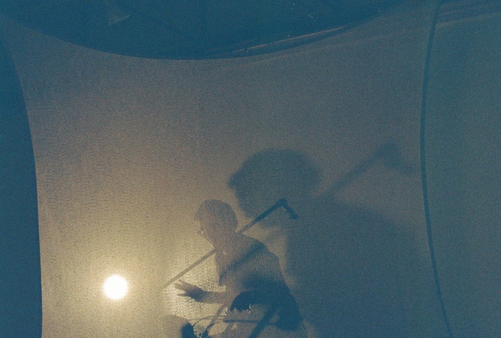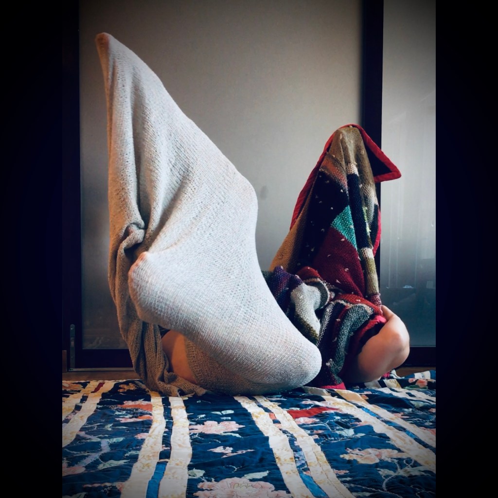 “NET/WORK” as a whole began as a collision of several seemingly-disparate creative modes: large-scale knitting as a way of measuring time in the presence of illness; unvarnished audio notes about my experiences as a queer & trans person living with Ehlers-Danlos Syndrome (EDS); sketchbook drawings of an imagined performance/installation space that would accommodate not just my physical access needs but also my desires for pleasure and comfort while performing; and videos of three short movement experiments I generated at the Mallard Island Artist Residency in summer 2018. In May 2019, with the support of a 20% Theatre Companyās Q-Stage: New Works Fellowship, I performed the first iteration of this project as an hour-long solo stage work. The performance included original audio/text, video projection, direct audience engagement, improvised movement, and an 8×8 foot handknit textile installation that I had created during the gestation period leading up to the show, which literally and symbolically supported my movement onstage. I performed an untitled precursor of NET/WORK at Mother Goose’s Bedtime Stories, curated by Xochi De La Luna, in February 2019 at Pangaea Theater; following the Q-Stage debut, I performed a new piece, Flight Experiment #1, at Squirrel Haus Arts in winter 2019.