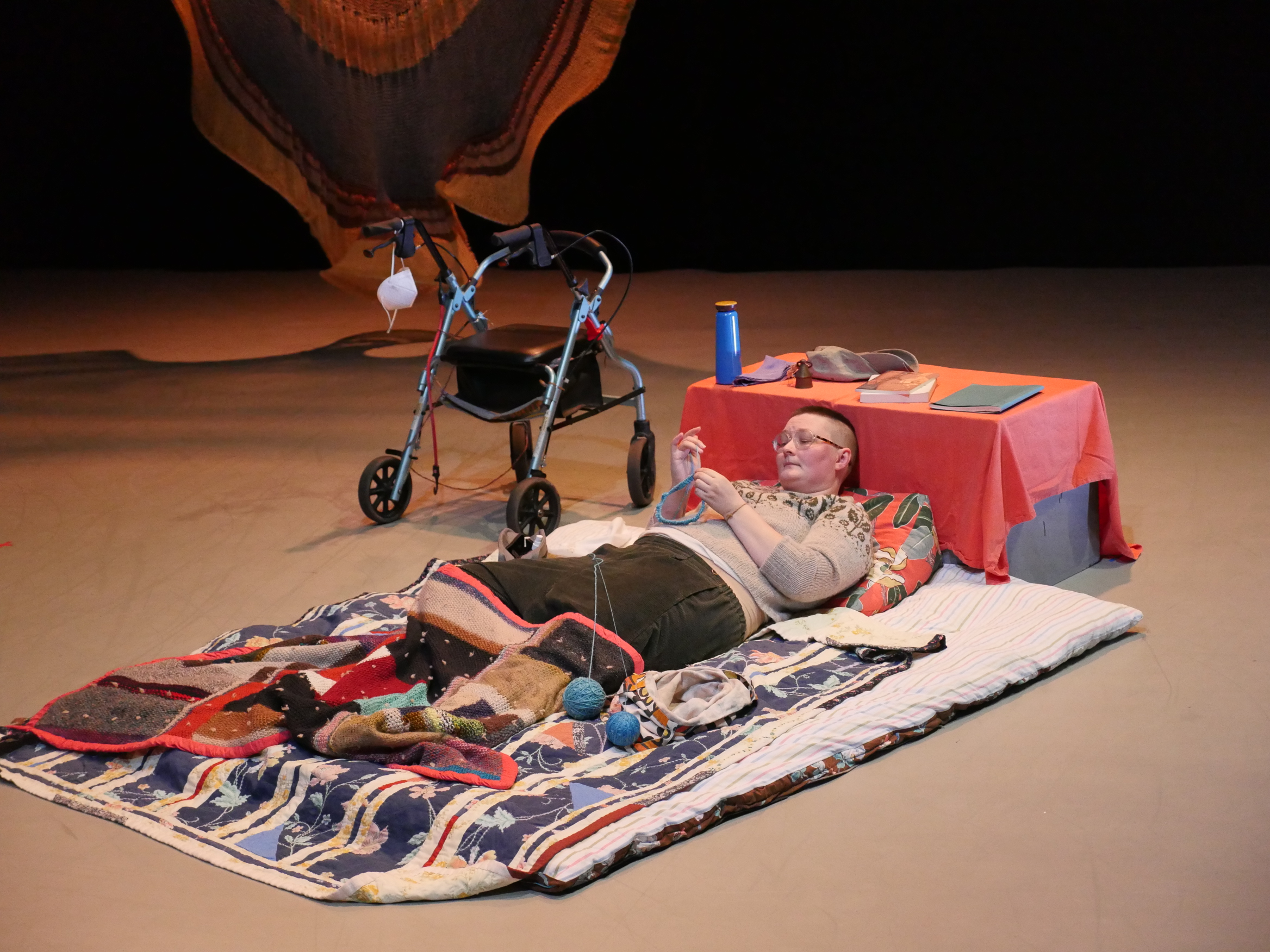 “NET/WORK: As Below,” took place in November 2022 at The Cowles Center Tek Box as part of the 7th Annual Right Here Showcase, co-produced by Marcela Michelle. “As Below” is a 40-minute solo work that includes two handknit textiles, “Performance Textile #2: Tube” and “Performance Textile #3: Parachute,” two handsewn quilts, a hand-stuffed mattress made of repurposed foam and bedsheets, original text and audio, improvised dance solos with mobility aids, and excerpts of Darnell Moore’s podcast Being Seen with guest Eddie Ndopu in Episode 4: “Creating Space.”